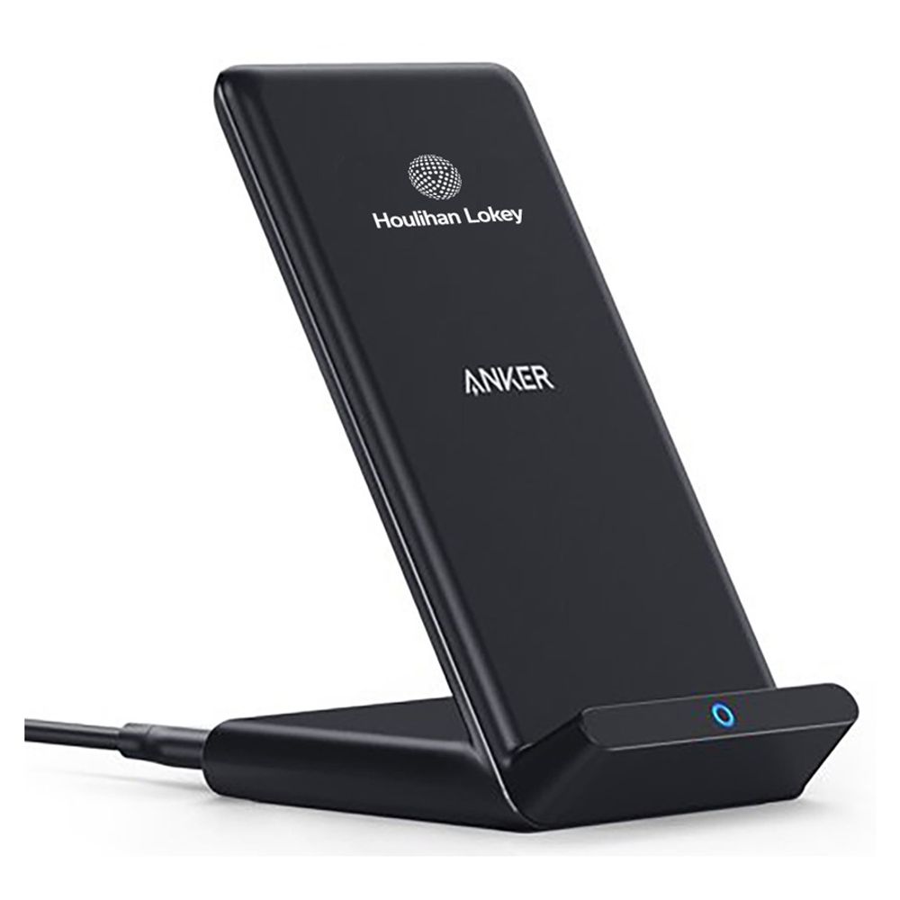 Anker Fast Wireless Qi Charger with up to 15W output. USB-C powered, 5W/ 7.5W / 10W / 15W capabilities. Charge in landscape orientation while watching videos, or portrait mode for messaging and facial recognition. Upgraded USB-C input. Includes USB-A to USB-C cable. 2.5" W x 4.5" H x 2.5" L.. Features your logo.